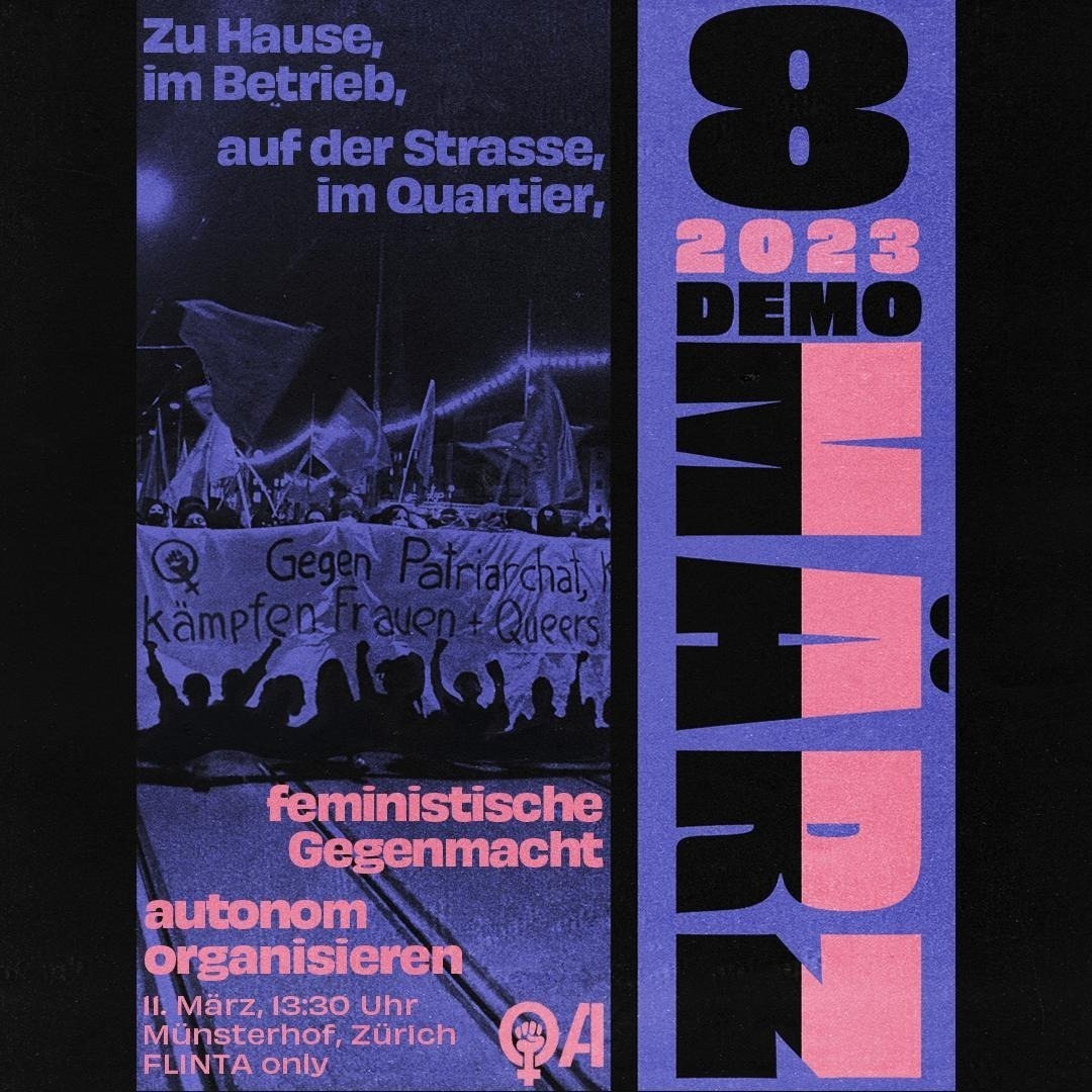 Wir wollen unsere Kämpfe auf die Strasse tragen, um die Gegenmacht, die wir in allen Bereichen des Lebens aufbauen, auch sichtbar zu machen. Diese kollektiven Momente geben uns nicht nur Kraft und Vertrauen in unsere Fähigkeiten. Öffentliche Aktionen und Demonstrationen sind ein wichtiges Instrument, um uns und anderen zu zeigen, was sich bewegt und wie stark wir sind! Dies tun wir in Zürich zum 8. März seit fast vierzig Jahren selbstbestimmt und ohne den Staat um Erlaubnis zu fragen, denn der Staat und sein Repressionsapparat sind dazu da, um das Kapital zu schützen. Deshalb gehen wir auch dieses Jahr mit unbewilligten Demos auf die Strasse. Am 8. März 2023 demonstrieren wir beispielsweise in Winterthur, Basel und Bern – sowie am Samstag, 11. März 2023 in Zürich. Wir lassen nicht locker, bis Patriarchat und Kapital zerschlagen sind!