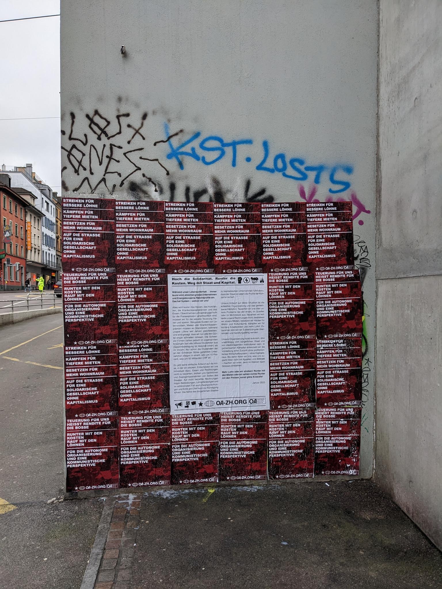 Unsere Antwort auf diese Situation ist die kollektive Organisierung und das gemeinsame Kämpfen. Tauschen wir uns über unsere Probleme bei der Arbeit, im Quartier oder im Wohnblock aus. Durch kollektives Handeln können wir den Umständen und unserer Ohnmacht etwas entgegensetzen. Bezahlen wir kollektiv unsere Rechnungen nicht, bestreiken wir unsere Mieten, besetzen wir Häuser für Wohn- und Kulturräume, kämpfen wir für kürzere Arbeitszeiten und mehr Lohn!