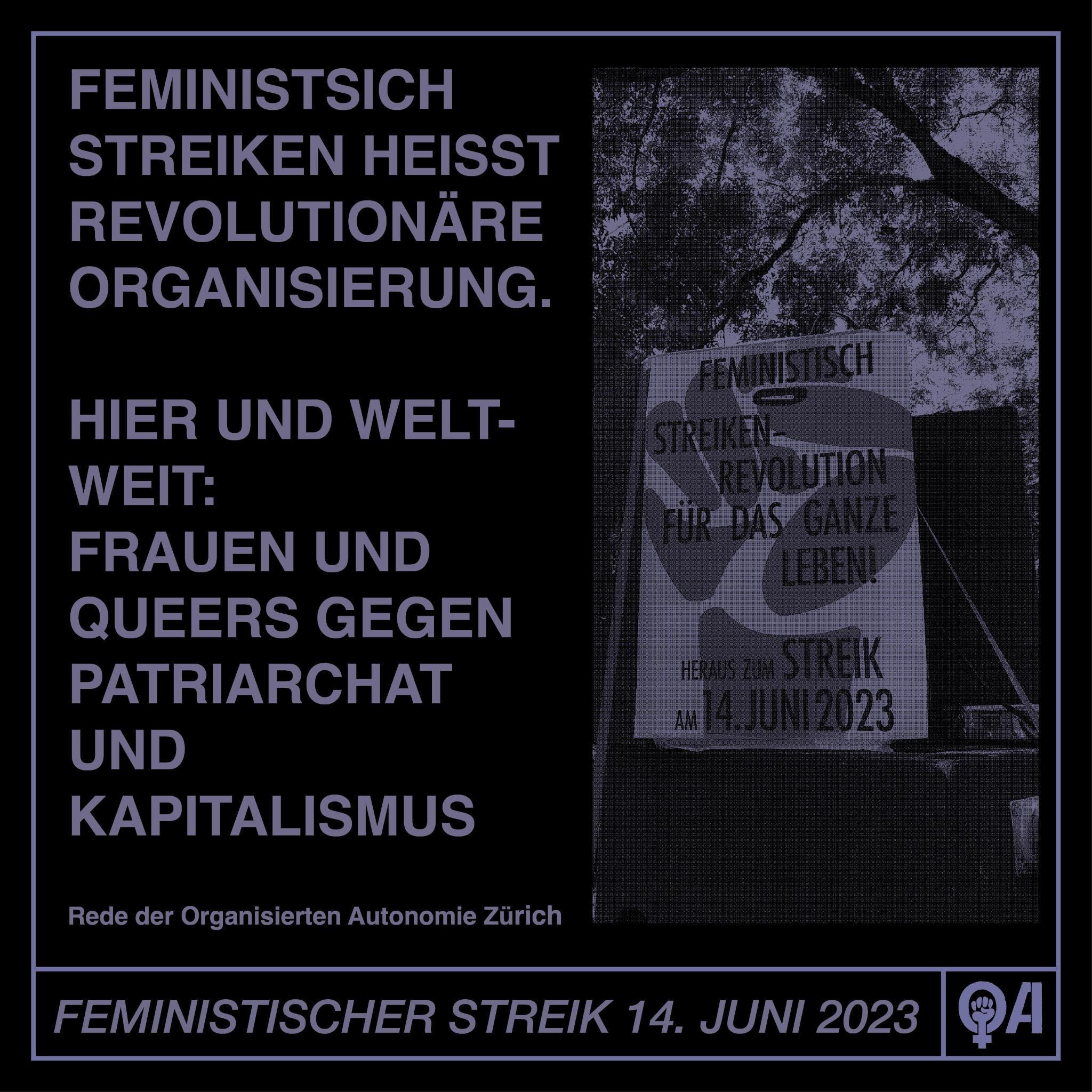 Aber wir fordern nicht blosse gesetzliche und ökonomische Verbesserungen innerhalb des bestehenden Systems, denn diese Verbesserungen können in diesem System nie für alle geschehen, sondern immer nur für einige wenige. Deshalb gehen wir für eine feministische Gegenmacht in die Offensive! Feministisch streiken heisst, revolutionäre Organisierung und Perspektiven zu schaffen und uns als Arbeiter:innenklasse zu vereinen. Eine feministische Revolution bedeutet eine Revolution, welche unser ganzes Leben umfasst, denn wir kämpfen nicht nur im Betrieb, sondern auch im Quartier, zu Hause, und auf der Strasse – für eine befreite Gesellschaft für alle!