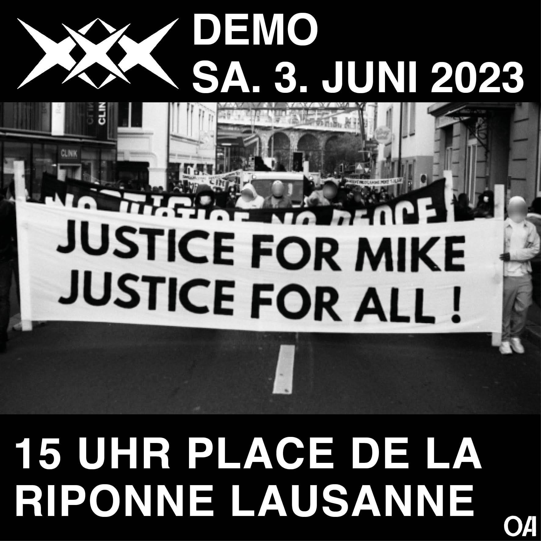 Zusammen mit vielen anderen Organisationen und Kollektiven rufen wir dazu auf, am Samstag, 3. Juni 2023 in Lausanne auf die Strasse zu gehen, um an Mike zu erinnern. Wir vergeben nicht und wir vergessen nicht. Justice for Mike, Justice for Nzoy! Kämpfen wir gemeinsam gegen staatlichen und polizeilichen Rassismus!