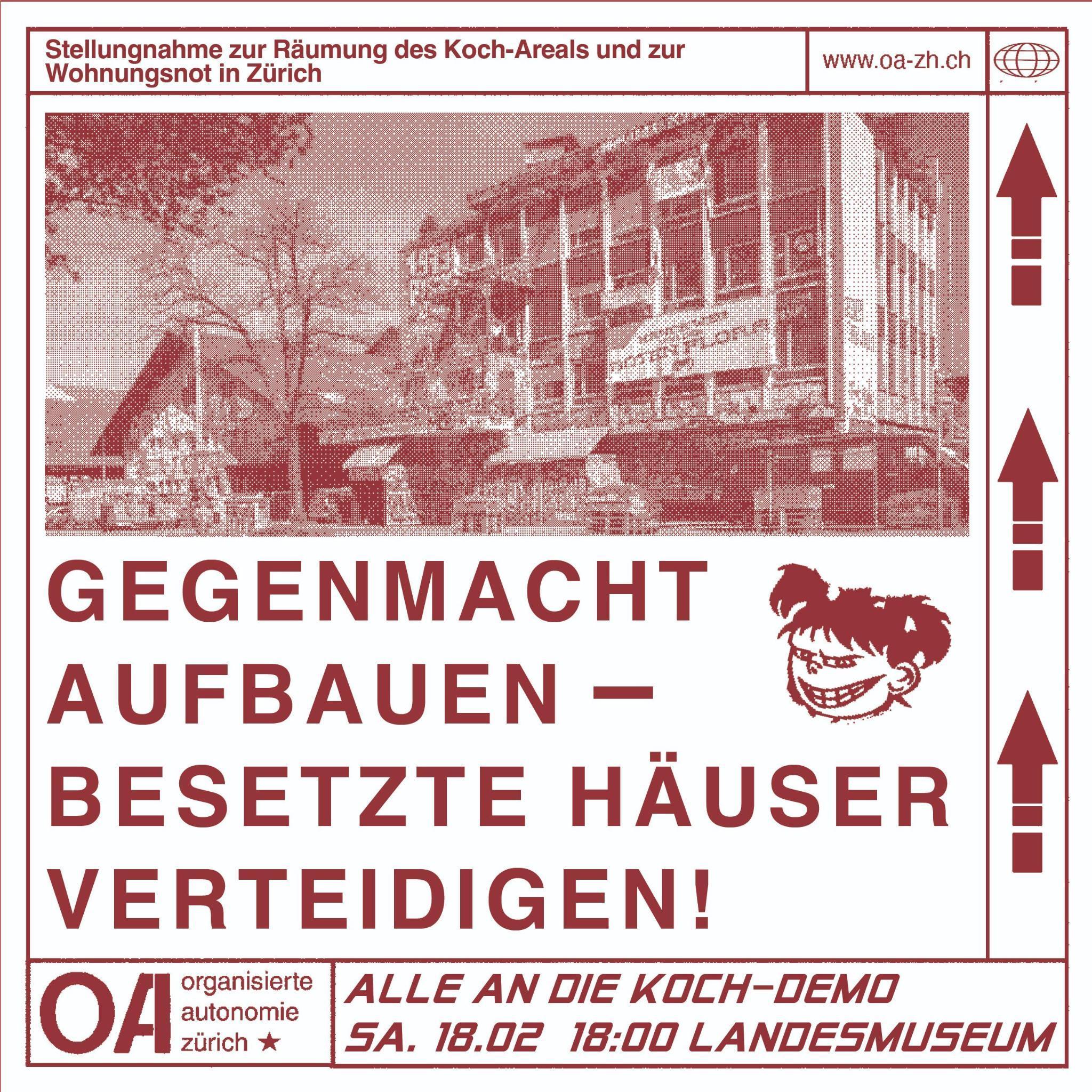 Wenn wir die Räumungen von besetzten Häusern und die fortschreitende Verteuerung von Wohnraum stoppen wollen, brauchen wir eine starke und widerständige Bewegung. Organisieren wir uns! Auf die Strasse gegen die Räumung des Koch-Areals! Alle an die Demo am 18. Februar 2023 um 18 Uhr beim Landesmuseum in Zürich!
