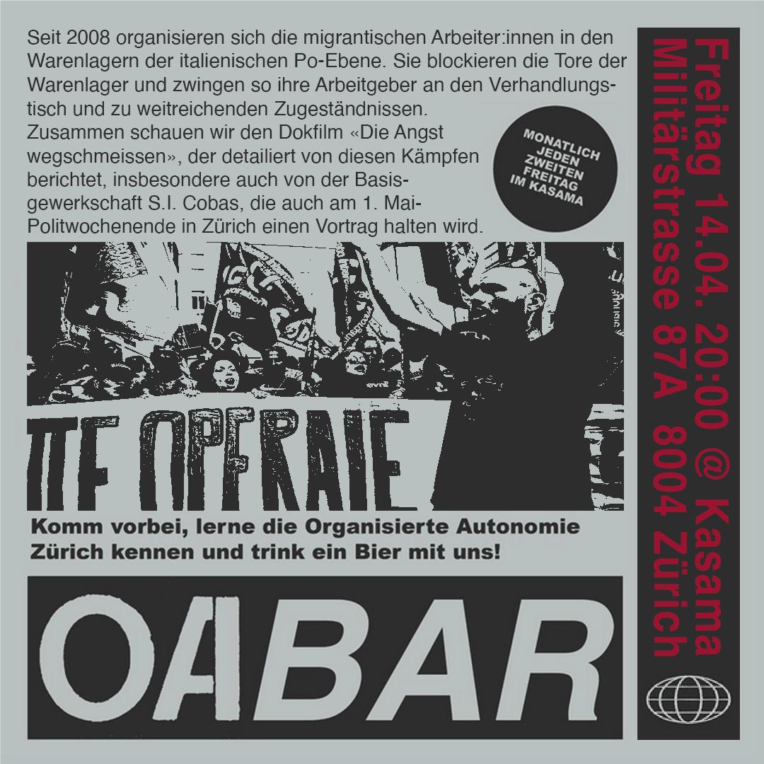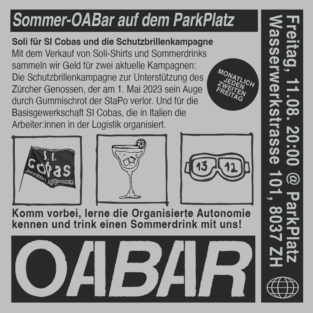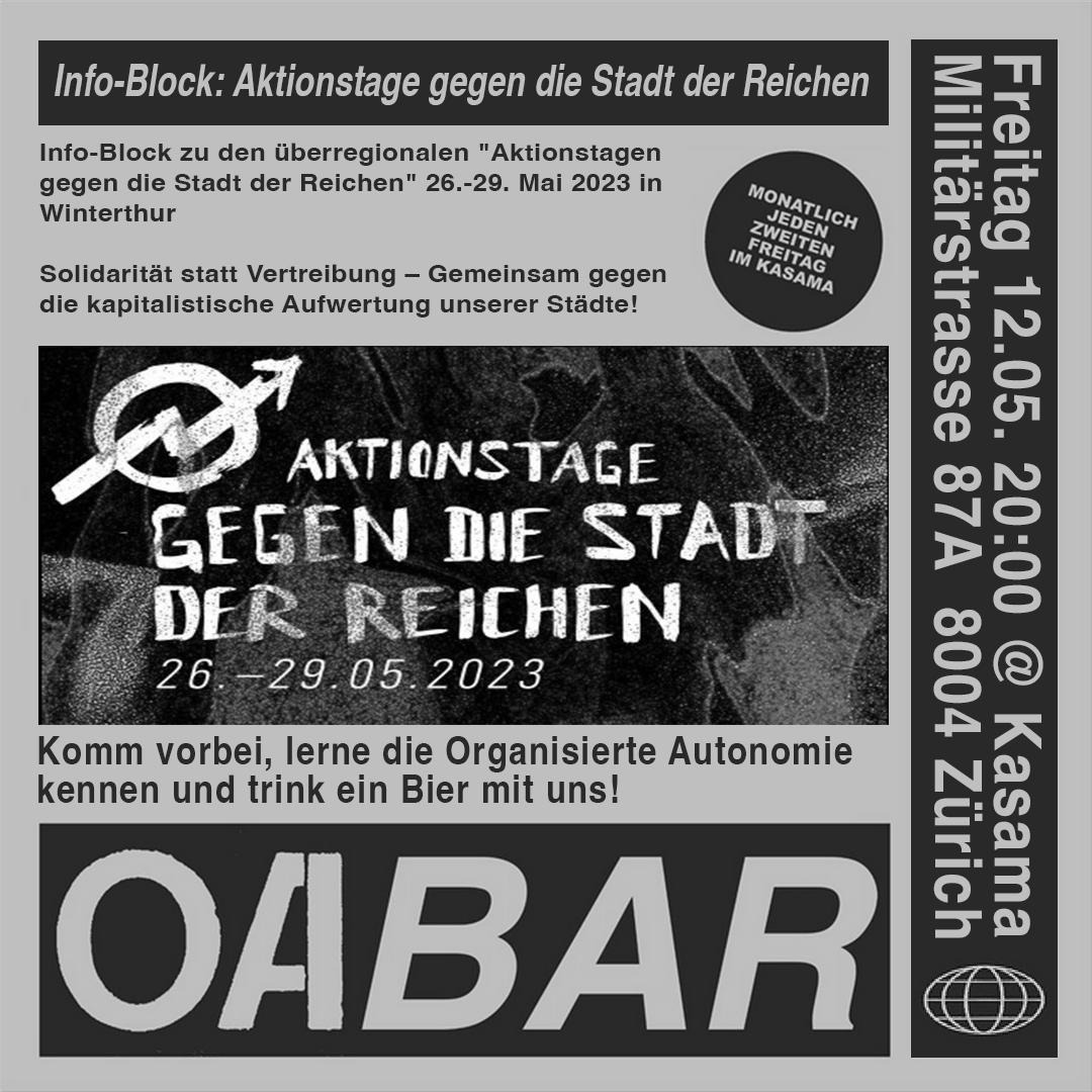 Freitagabend, 12.5. in Zürich: OA-Bar mit einem Info-Block über den Kampf gegen kapitalistische Stadtaufwertung in Winterthur, namentlich über die Kampagne #oisistadt des RJBW und zu den Aktionstagen gegen die Stadt der Reichen, die übers Pfingstwochenende stattfinden.