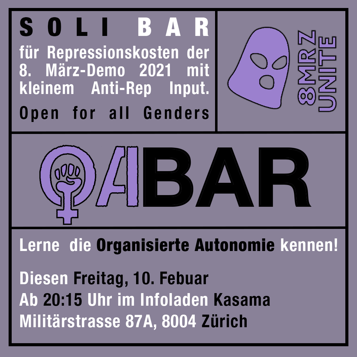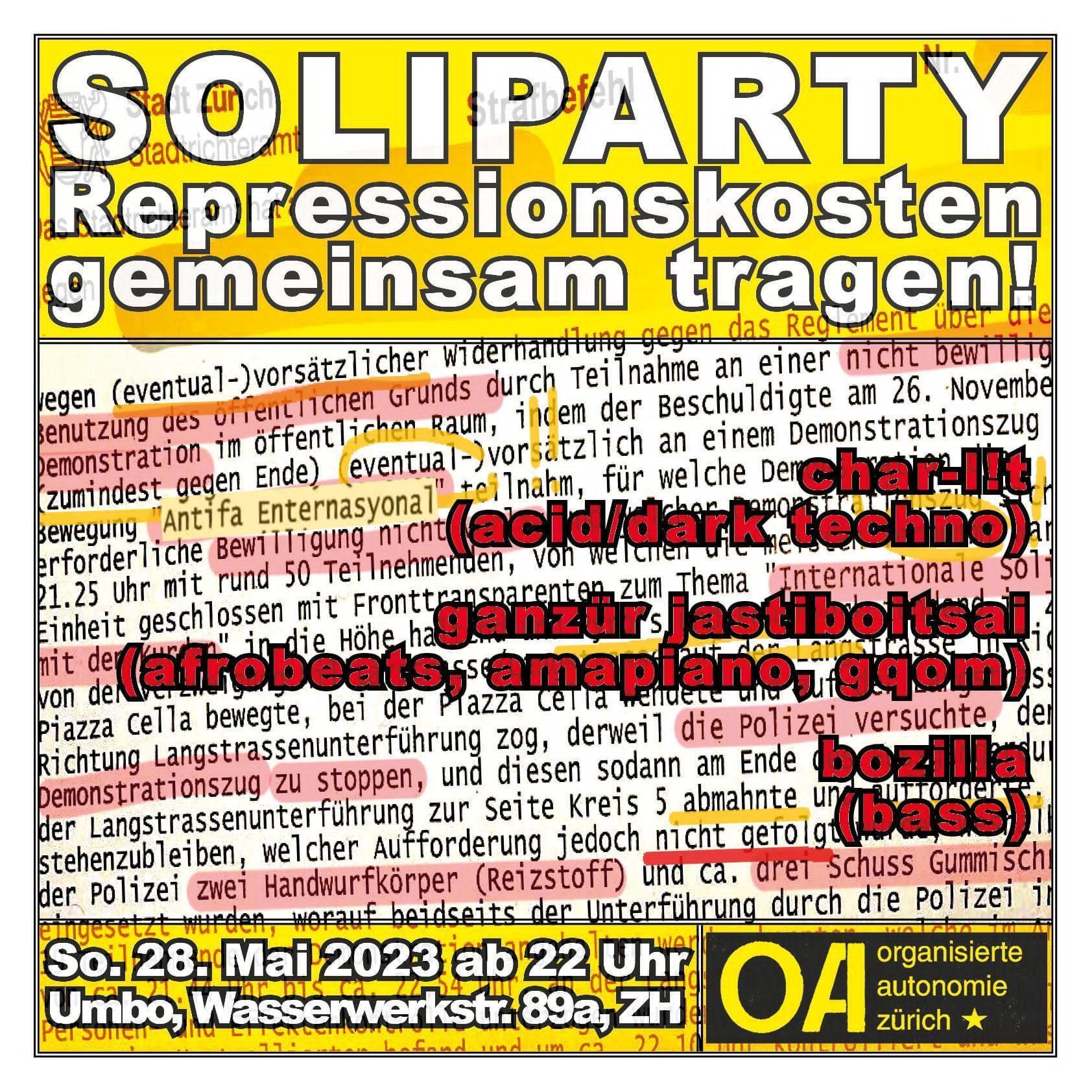 Wir feiern und sammeln Kohle für Genoss:innen, die Bussen berappen müssen. Egal ob jemand «(eventual-)vorsätzlich an einem Demonstrationszug der Bewegung Antifa Enternasyonal» teilnimmt oder sich den religiösen Fundis des «Marsch fürs Läbe» in den Weg stellt – Repressionskosten tragen wir gemeinsam!