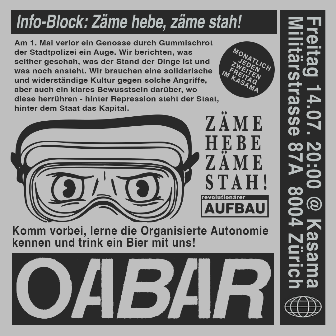 Zusammen mit Genoss:innen des Revolutionären Aubau blicken wir zurück auf die Geschehnisse des 1. Mai 2023. Am diesjährigen Tag der Arbeit verlor ein Genosse durch Gummischrot der Stadtpolizei ein Auge. Wir berichten, was seither geschah, was der Stand der Dinge ist und was noch ansteht. Wir brauchen eine solidarische und widerständige Kultur gegen solche Angriffe, aber auch ein klares Bewusstsein darüber, wo diese herrühren – hinter Repression steht der Staat, hinter dem Staat das Kapital.