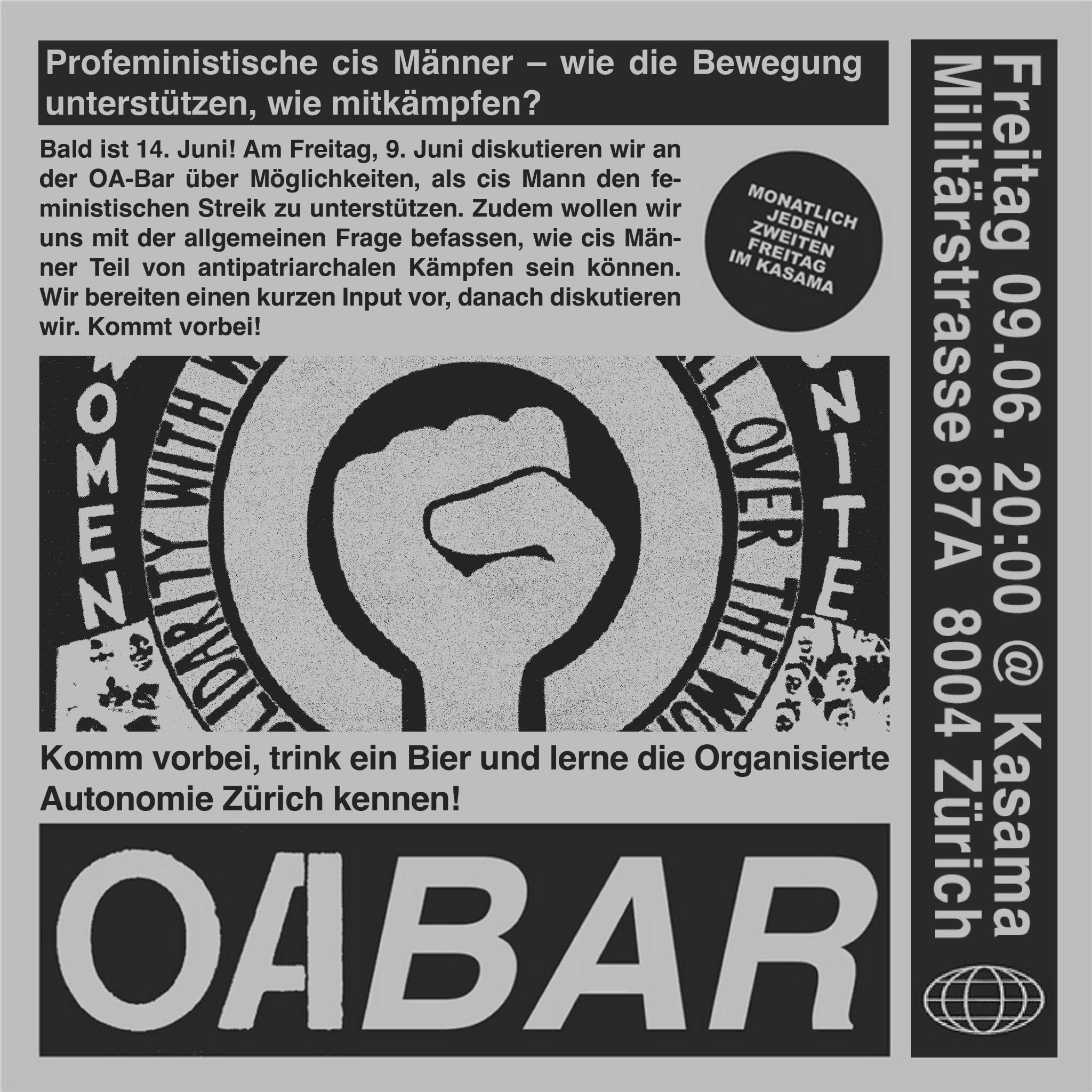 Bald ist 14. Juni - der feministische Streik! Am Freitag, 9. Juni diskutieren wir an der OA-Bar über Möglichkeiten, als cis Mann den feministischen Streik zu unterstützen. Zudem wollen wir uns mit der allgemeinen Frage befassen, wie cis Männer Teil von antipatriarchalen Kämpfen sein können.