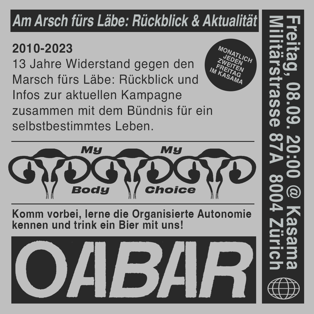 Weltweit haben Feminist:innen das Recht, selbst über Schwangerschaften entscheiden zu können, hart erkämpft. Antifeministische Angriffe auf diese Errungenschaften richten sich insbesondere gegen schwangere Menschen aus der arbeitenden Klasse. Indem wir uns organisieren und unsere Kämpfe kollektivieren, bauen wir Gegenmacht auf. Die starke feministische Bewegung der letzten Jahre zeigt uns, wie wir revolutionäre Politik vorwärtsbringen können und wie feministische Gegenmacht in der Lage ist, patriarchale Strukturen aufzubrechen. Als proletarische Klasse können wir den reaktionären Entwicklungen entgegenwirken, indem wir die Logiken und Funktionsweisen dieser Bewegungen aufschlüsseln und indem wir unsere Rechte verteidigen – so auch am 16. September 2023 in Oerlikon. Wir gehen nicht hinter die erkämpften Errungenschaften zurück! Gemeinsam können wir revolutionäre Perspektiven fassbar machen. Organisieren wir uns für eine solidarische Gesellschaft!