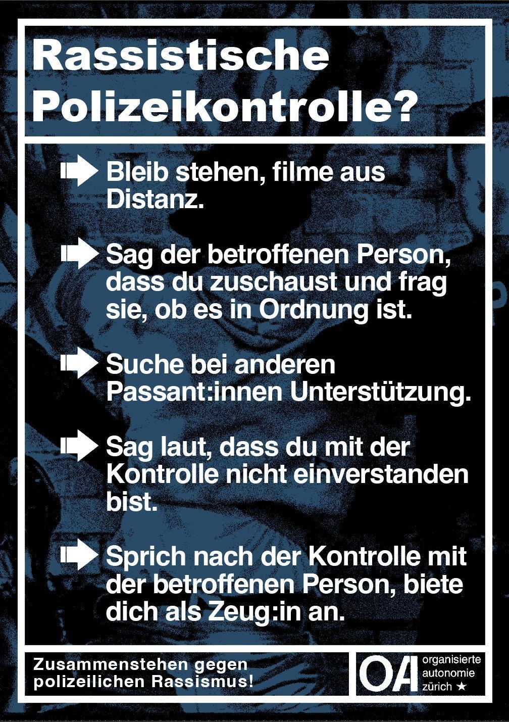 Es ist klar, dass wir im Moment zu wenig stark sind, um die Cops zum Teufel zu jagen, wenn sie rassistisch motivierte Polizeikontrollen durchführen. Aber es ist wichtig, dass wir uns damit befassen, wie wir reagieren können. Wir wollen zeigen, dass es uns nicht egal ist, wenn die Bullen Racial Profiling betreiben.